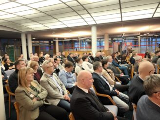 Landrat Stefan Sternberg machte in seinem Beitrag deutlich: „Unser Landkreis ist stark“. Es gibt eine 75 %ige Auslastung der Gewerbestandorte, weitere Ansiedlungen sind im Gespräch. Die digitale Bauakte ist seit Januar eingeführt. Weitere Verwaltungsakte zu digitaliseren wäre technisch schon möglich, scheitert aber an noch fehlenden rechtllichen Voraussetzungen, die im Bund zu schaffen sind. Für 2026 liegt ein Schwerpunkt auf umfangreichen Investitionen in Schulen und in die Infrastruktur. Man sei ein sehr handlungsfähiger Landkreis, der Haushalt steht. Ein limitierender Faktor für eine weitere wirtschaftliche Entwicklung sind die notwendigen Fachkräfte bei einer insgesamt schrumpfenden Bevölkerung. Sein Appell an alle: Sprecht positiv über unseren Landkreis – auch über die Landesgrenzen hinaus – lasst uns im Gespräch bleiben und den Zusammenhalt stärken.