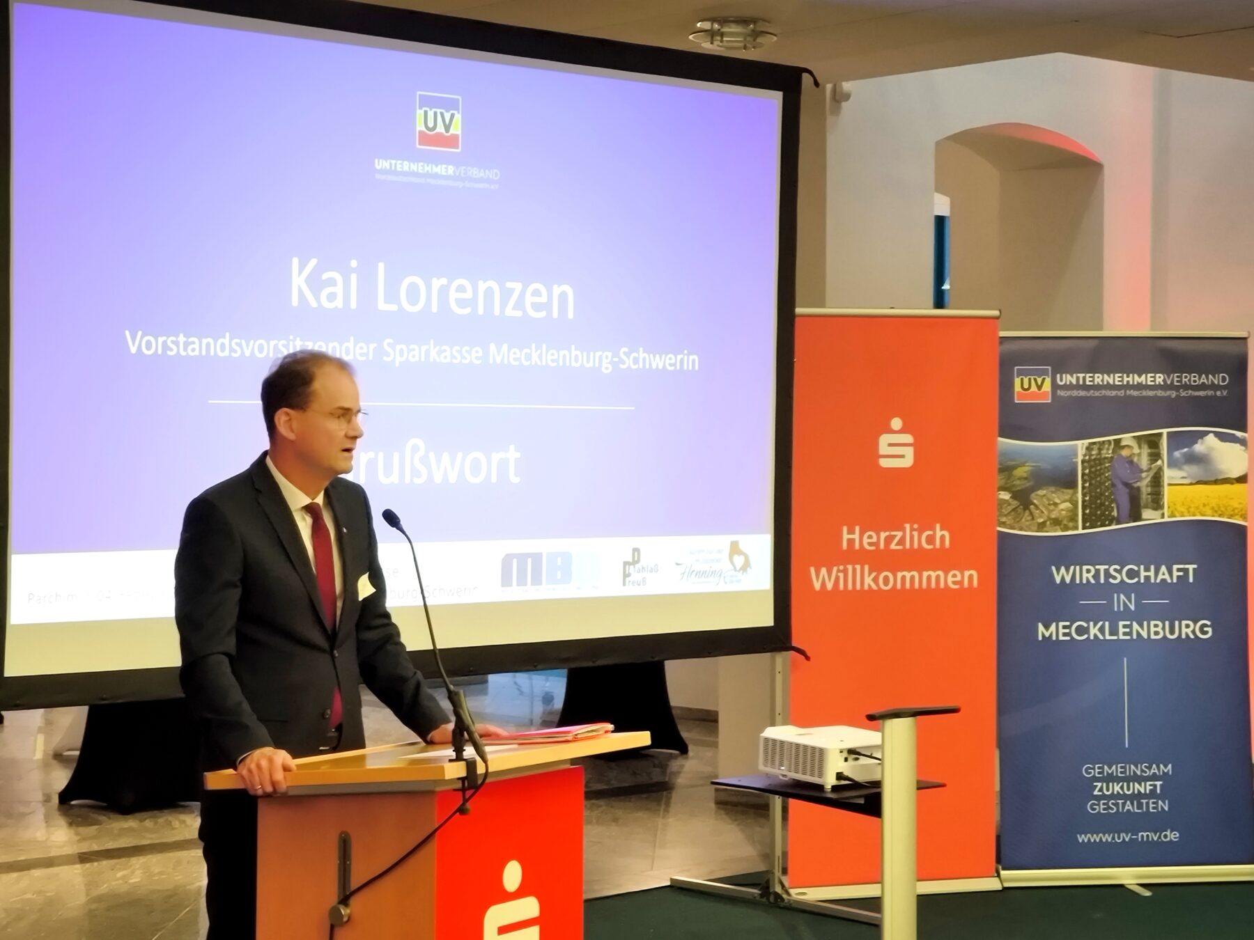 Kai Lorenzen, Vorstandsvorsitzender der Sparkasse Mecklenburg-Schwerin, ordnete anschließend die Lage mit Blick auf die Finanzwelt vorsichtig positiv ein: Die Wirtschaft wird komplexer, Geschäftsmodelle verändern sich – und bei allen Risiken gilt es, Chancen aktiv zu nutzen. Sein klares Versprechen: „Wir sind digital gut aufgestellt, aber werden keine reine Digitalbank – bei uns steht das persönliche Gespräch weiterhin im Fokus.“