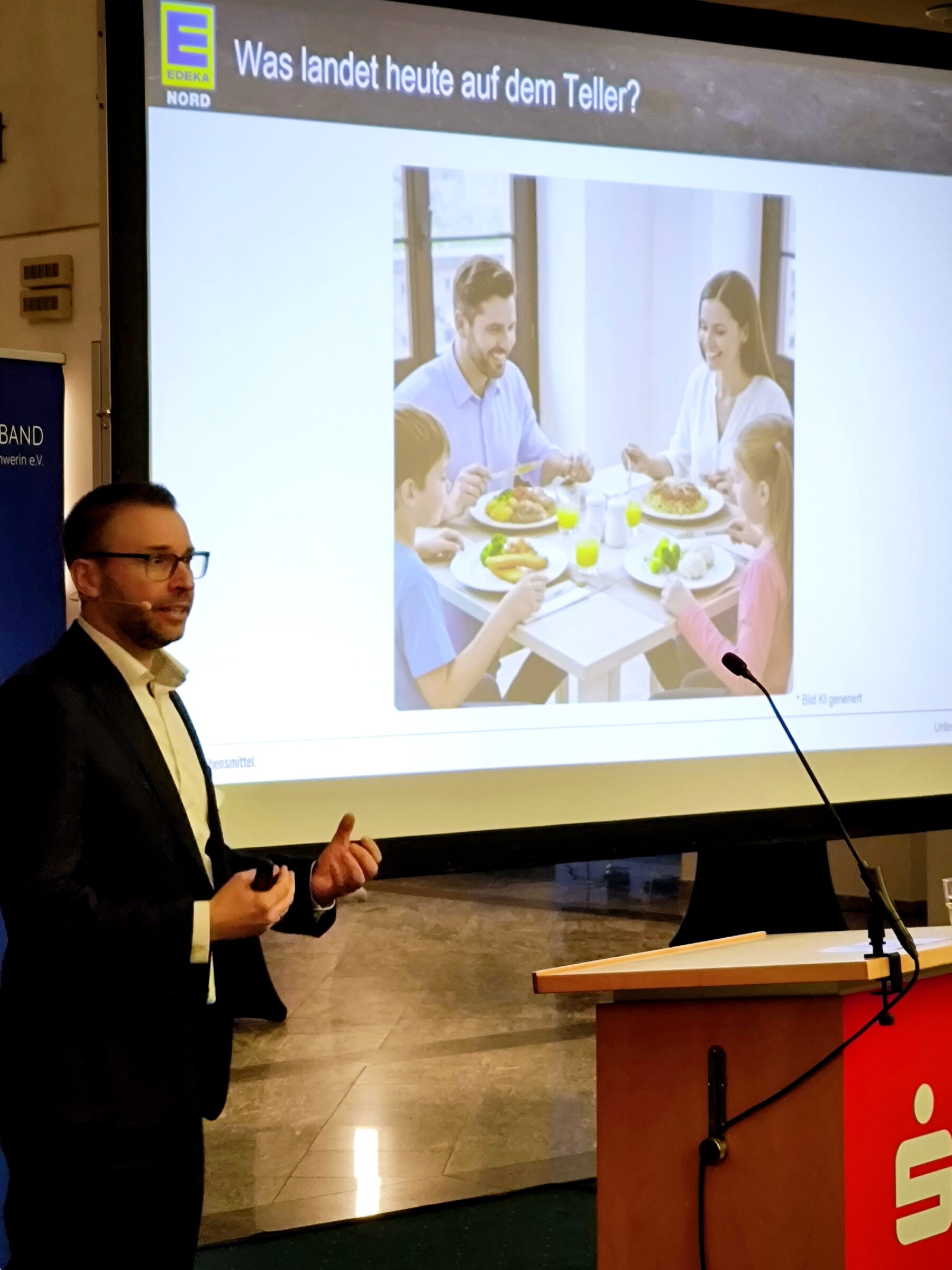 Einen lebendigen Blick aus der betrieblichen Praxis lieferte dann Matthias Biermann, Geschäftsführer des EDEKA Fleischwerks Valluhn, entlang der Frage: „Was kommt morgen auf den Teller – und wer sorgt dafür, dass es dort ankommt?“ Deutlich wurde: Unser Essverhalten verändert sich, regional unterschiedlich, aber mit klarer Tendenz (u. a. sinkender Schweinefleischkonsum). Gleichzeitig zeigte er, was Transformation im Betrieb heißt: Nach der Neuregulierung in der Fleischbranche stellte sich das Unternehmen neu auf: Heute arbeiten dort Mitarbeitende aus 23 Nationen. Lösungen wie Wohnraumbeschaffung, Shuttle-Service und persönliche Betreuung helfen, Herausforderungen im Alltag zu stemmen. Und: Wo Anerkennung und Verfahren nicht mit der Realität Schritt halten (z. B. bei Qualifikationen wie Berufskraftfahrer*innen), braucht es praxistaugliche Antworten.
