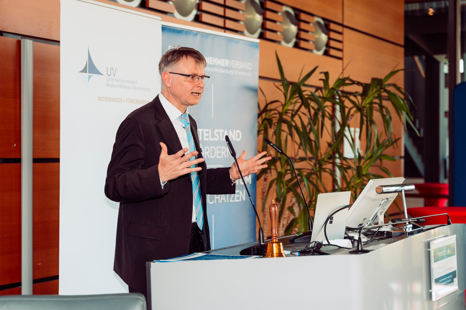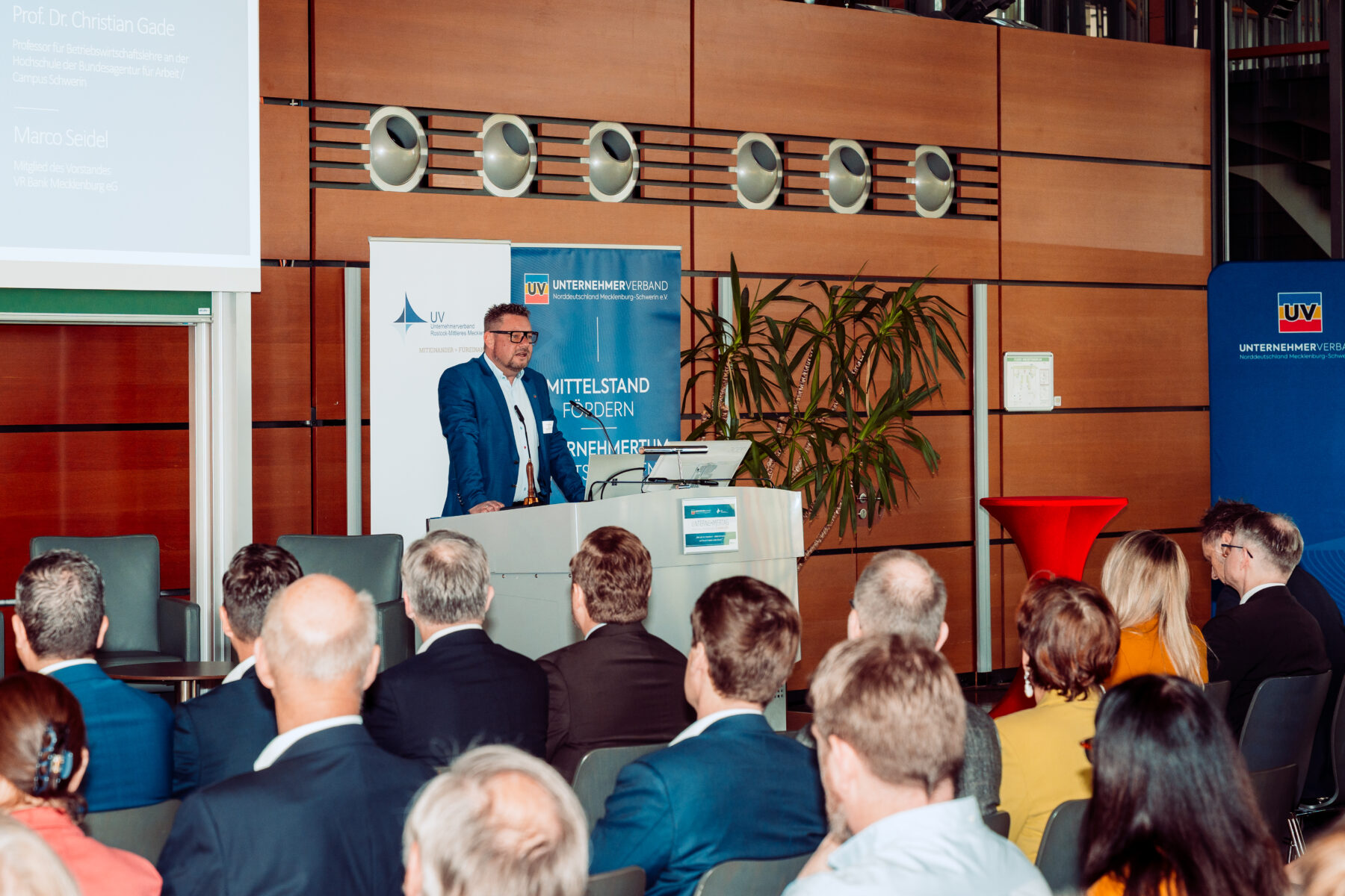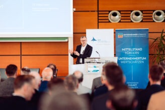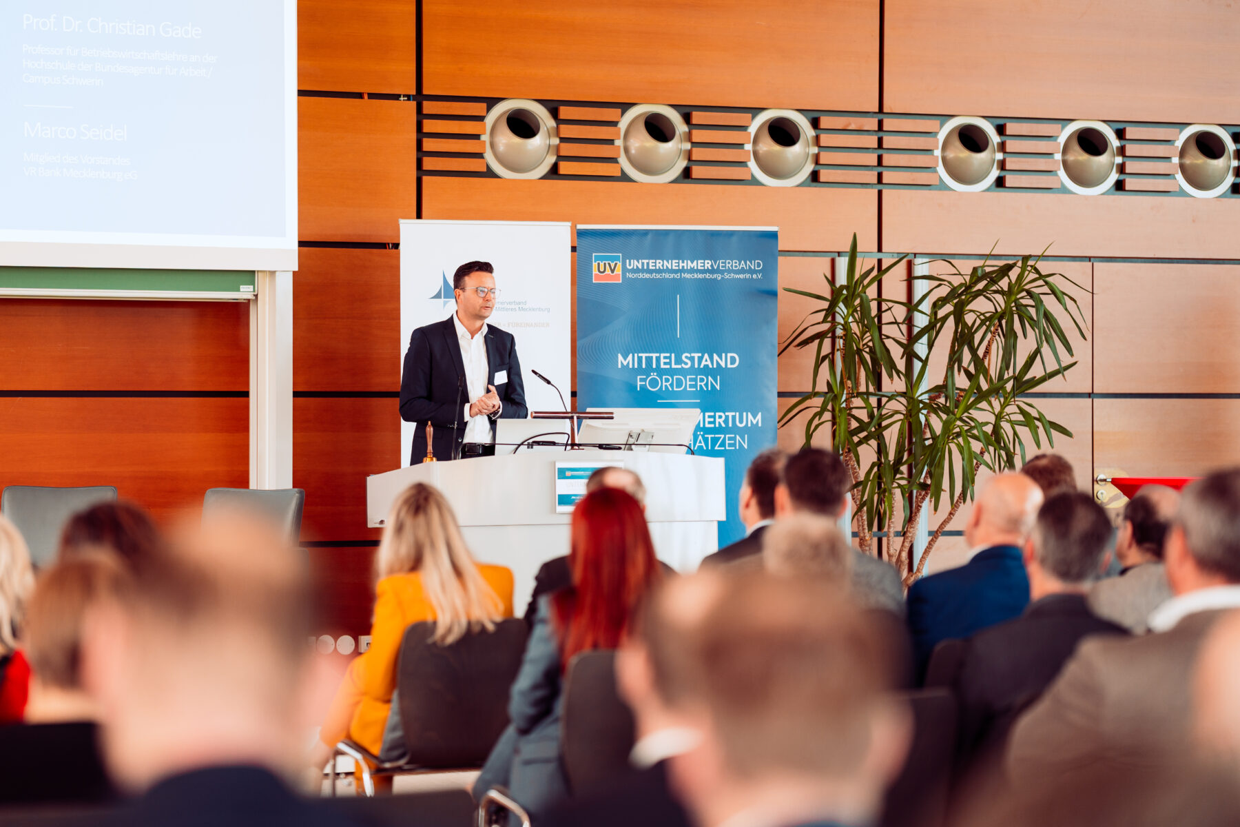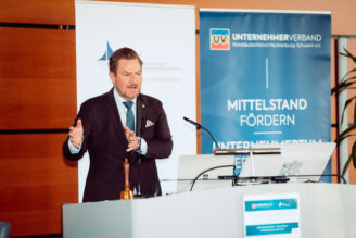 Finanzminister Dr. Heiko Geue versicherte in seinem Grußwort, dass man verstanden hat und auf dem Weg ist, aber bis spürbare Effekte eintreten, noch Zeit vergehen wird: „Wir brauchen Beschleunigungsgesetze. Sonst reden wir weiter – und kommen nicht zu Potte.“ Marco Seidel, Vorstandsmitglied der VR Bank Mecklenburg eG, machte deutlich: „Was der Staat an Investitionen versäumt, landet als strukturelle Wettbewerbsschwäche in den Bilanzen der Unternehmen.“