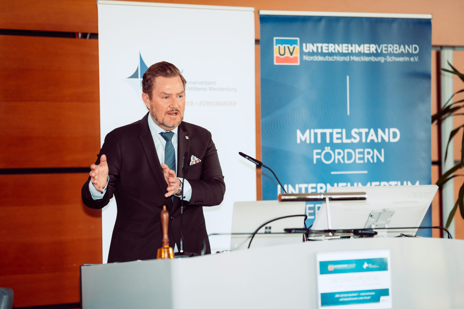„Wer soll das bezahlen?“ – der Unternehmertag 2026 rückte den immensen Finanzdruck auf Unternehmen und Staat in den Mittelpunkt. Rund 150 Unternehmerinnen und Unternehmer, politische Entscheider und Fachleute kamen zur gemeinsamen jährlichen Veranstaltung des Unternehmerverbandes Norddeutschland Mecklenburg-Schwerin e.V. und des Unternehmerverbandes Rostock-Mittleres Mecklenburg e.V. in Schwerin zusammen. Der Unternehmertag hat eindrucksvoll gezeigt, wie groß der Druck auf Unternehmen und öffentliche Haushalte inzwischen ist und wie wichtig klare wirtschaftspolitische Antworten geworden sind. Im Fokus standen insbesondere die Mittelstandsfinanzierung, die Rolle der Banken und Förderinstitutionen hinsichtlich der Themen Investieren, Konsolidieren oder Liquidität sichern sowie die zunehmende Belastung durch regulatorische Anforderungen. Aber auch der fianzielle Druck auf Seiten des Staates, unserer Länder und Kommunen kam zur Sprache.