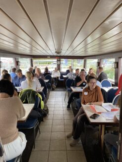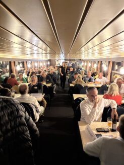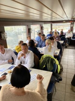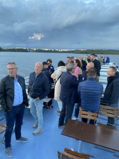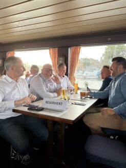 Die Stimmung war so gut, dass viele noch gern mehr Zeit an Bord verbracht hätten. Es gab reichlich Stoff zum Austausch! Und wie immer ist das abendliche Anlegen an Deck mit Blick auf das Schloss Anlass, die Handys für ein Foto zu zücken. Und damit den 100 Bildern vom Schweriner Schloss ein weiteres hinzuzufügen…