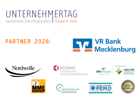 Der UV-Unternehmertag wird auch im Jahr 2026 wieder von der VR Bank Mecklenburg eG sowie weiteren Partnern unterstützt.